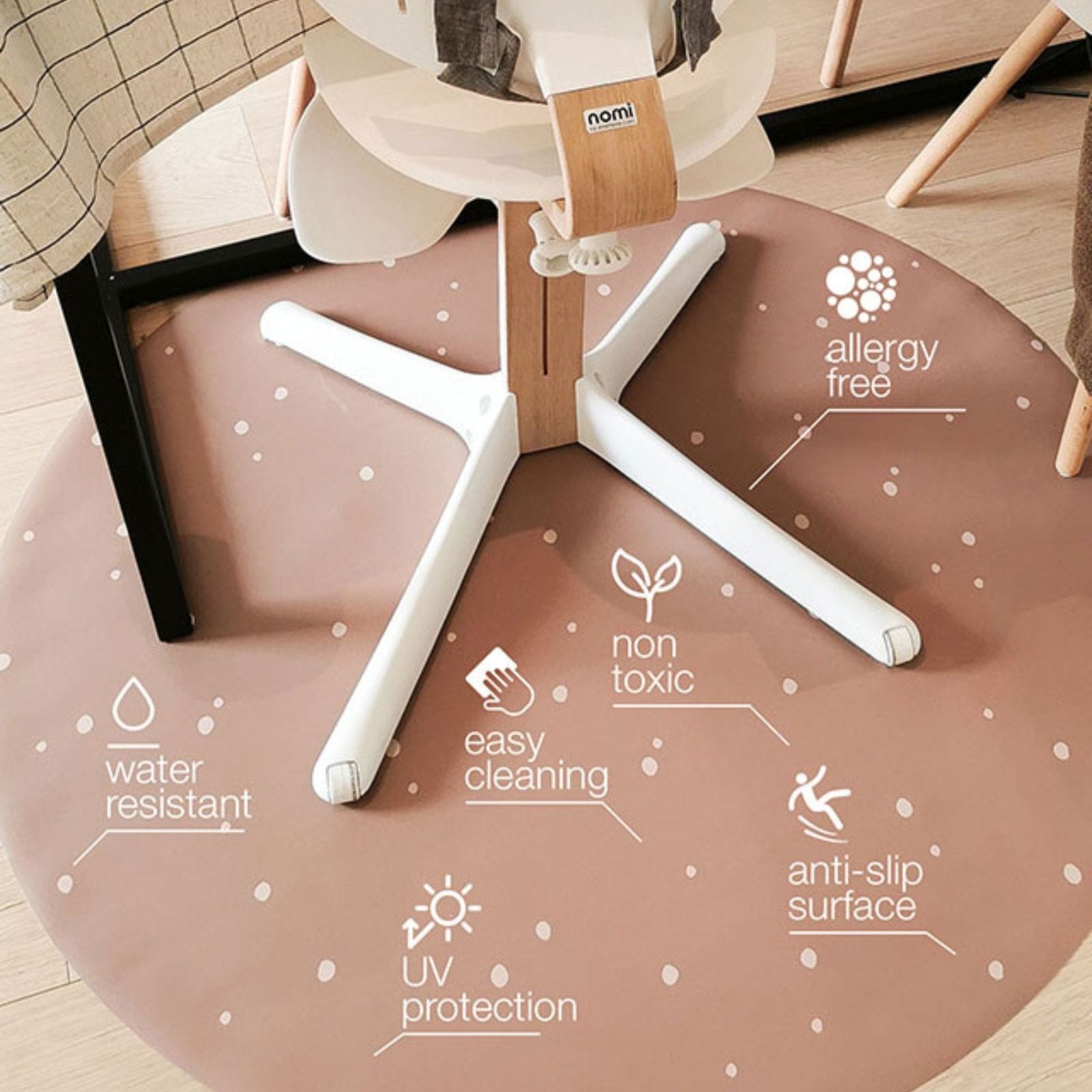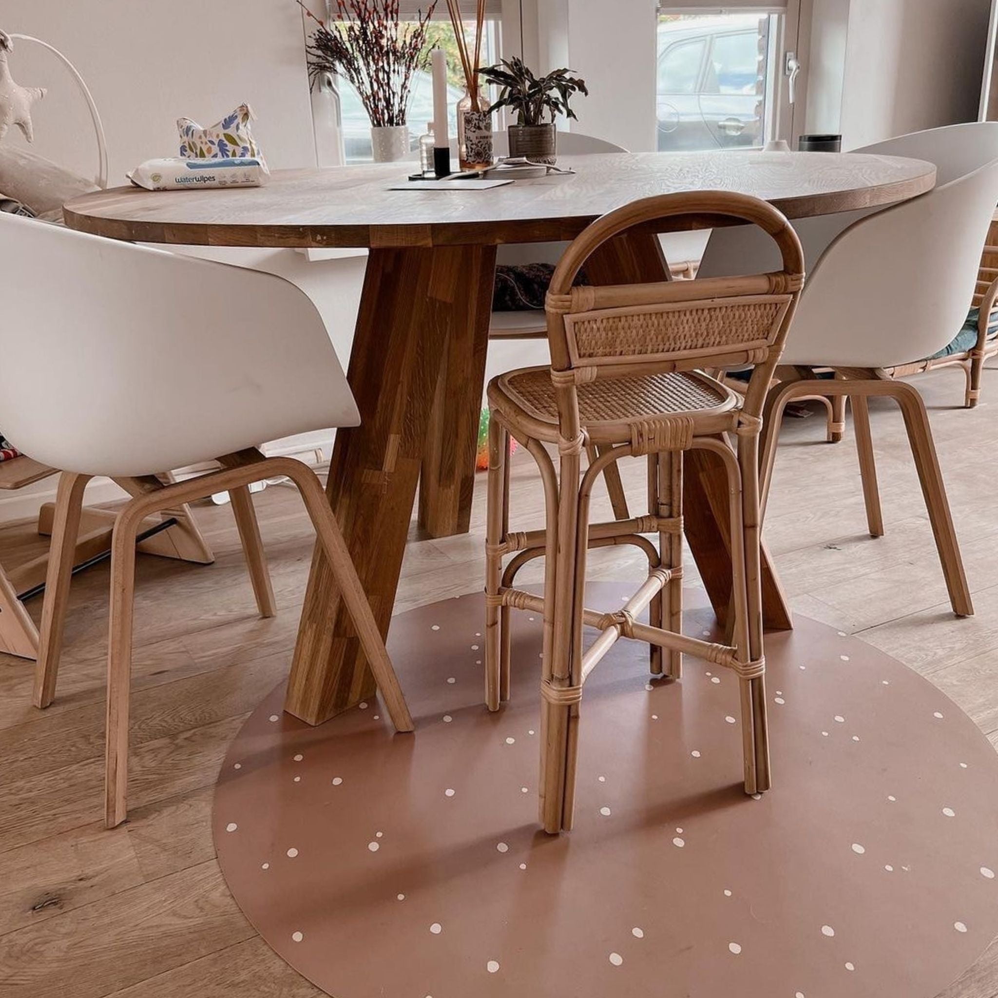Tijdens de eerste hapjes of een knutselsessie: een goede knoeimat voor onder de kinderstoel is een must-have. Onze ronde knoeimat voor baby’s biedt bescherming zonder in te leveren op stijl. De vinyl knoeimat is makkelijk schoon te maken, waterdicht én verkrijgbaar in rustige kleuren en designs, perfect voor elk interieur. Dit is de ideale combinatie van praktisch en mooi!