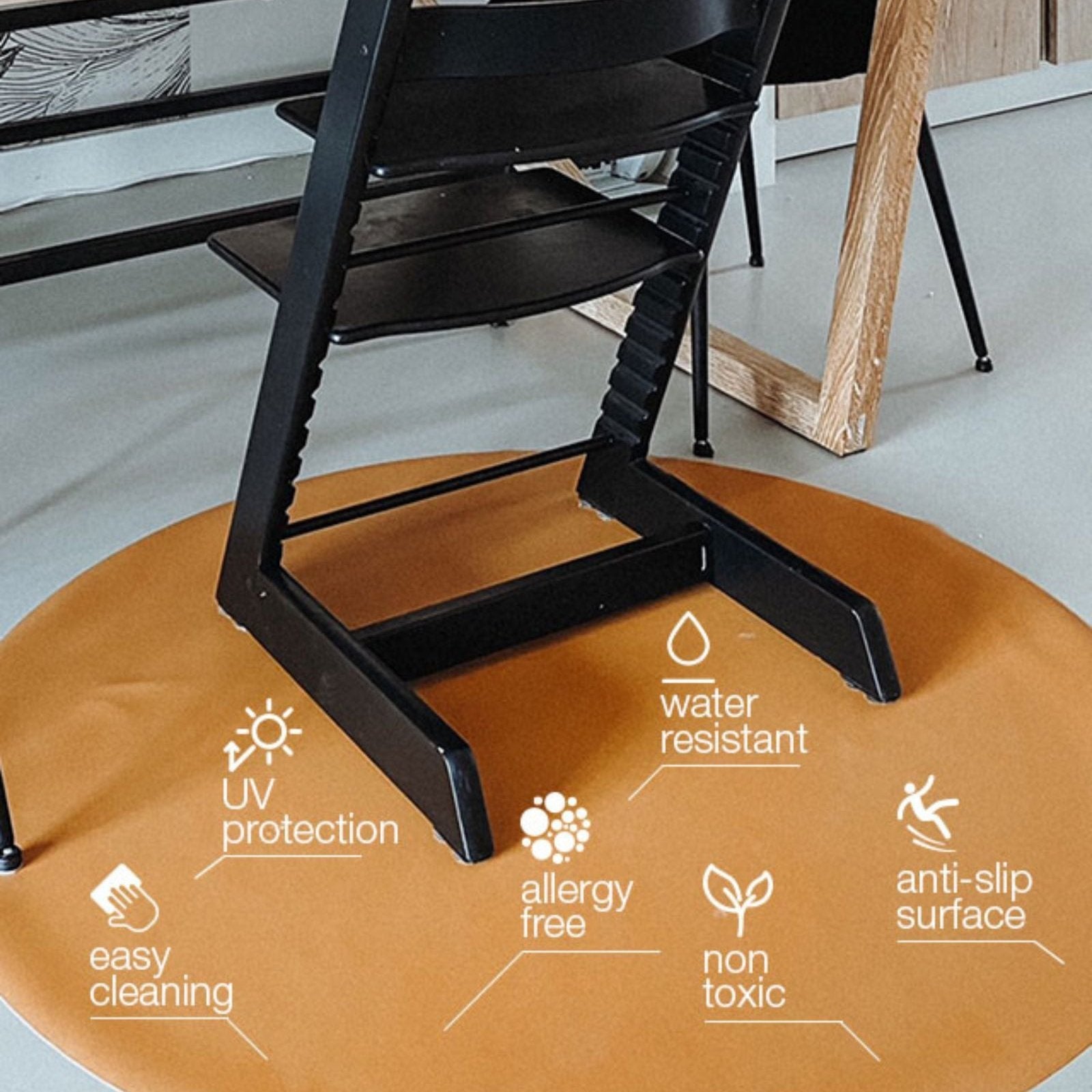 Onze stevige knoeimat voor kinderen blijft goed liggen, zelfs bij druk spel. Ideaal voor sensorisch spel, als ondergrond voor verfprojecten of als stijlvolle knoeimat in de tuin. In tegenstelling tot lichte alternatieven kiezen wij bewust voor meer materiaal: dat maakt deze knoeimat voor onder de kinderstoel stabieler en extra duurzaam. Gemaakt van hoogwaardig vinyl – jarenlang plezier, zonder verschuiven.