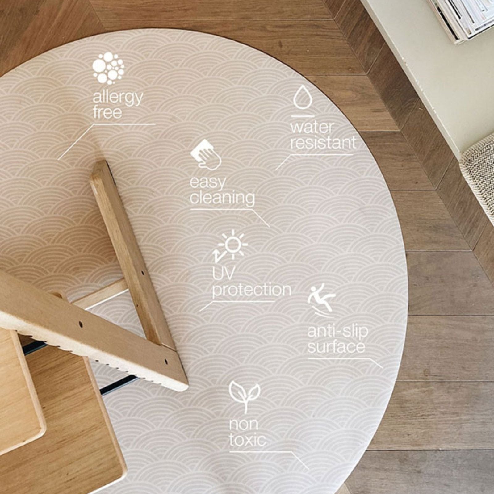 Tijdens de eerste hapjes of een knutselsessie: een goede knoeimat voor onder de kinderstoel is een must-have. Onze ronde knoeimat voor baby’s biedt bescherming zonder in te leveren op stijl. De vinyl knoeimat is makkelijk schoon te maken, waterdicht én verkrijgbaar in rustige kleuren en designs, perfect voor elk interieur. Dit is de ideale combinatie van praktisch en mooi!