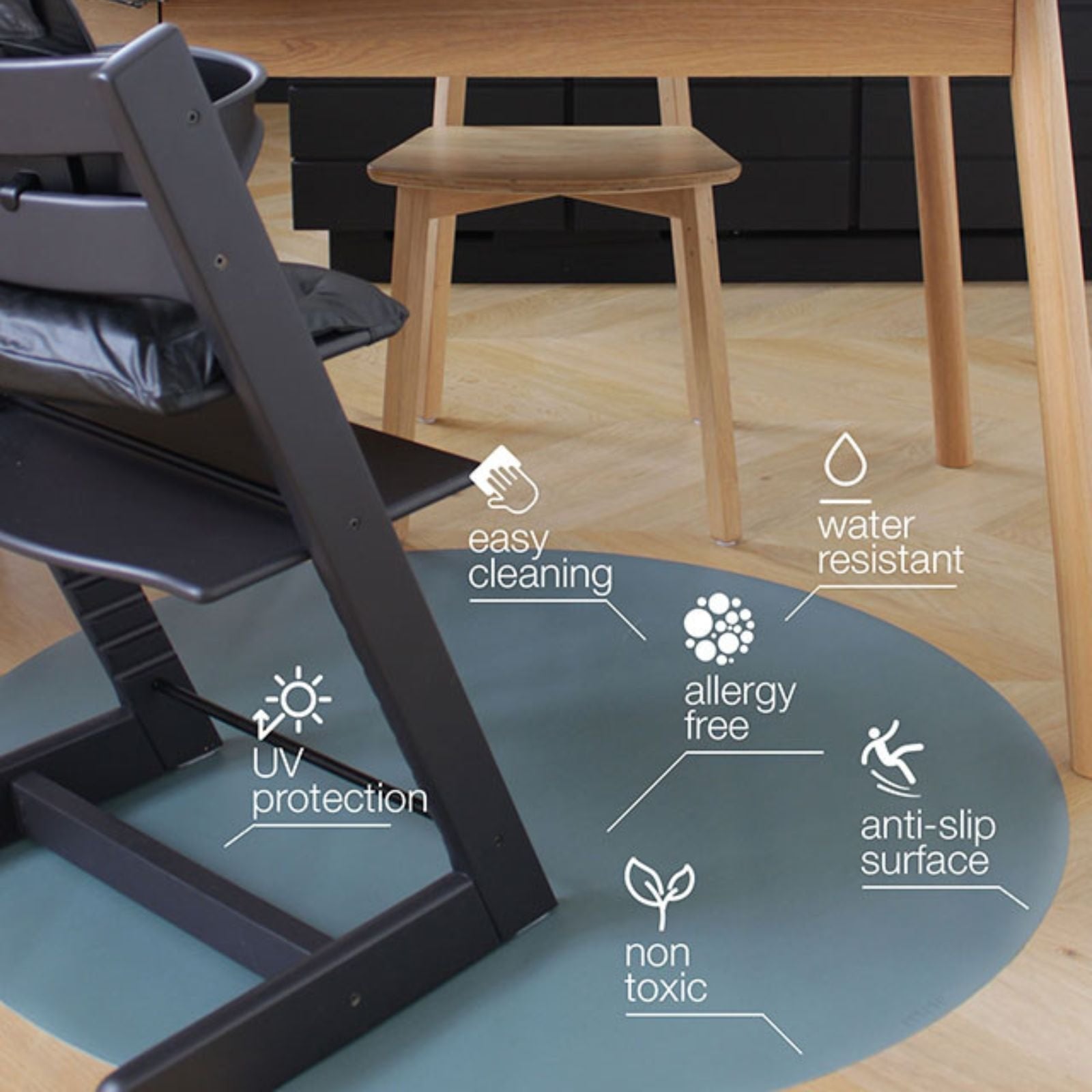 Tijdens de eerste hapjes of een knutselsessie: een goede knoeimat voor onder de kinderstoel is een must-have. Onze ronde knoeimat voor baby’s biedt bescherming zonder in te leveren op stijl. De vinyl knoeimat is makkelijk schoon te maken, waterdicht én verkrijgbaar in rustige kleuren en designs, perfect voor elk interieur. Dit is de ideale combinatie van praktisch en mooi!